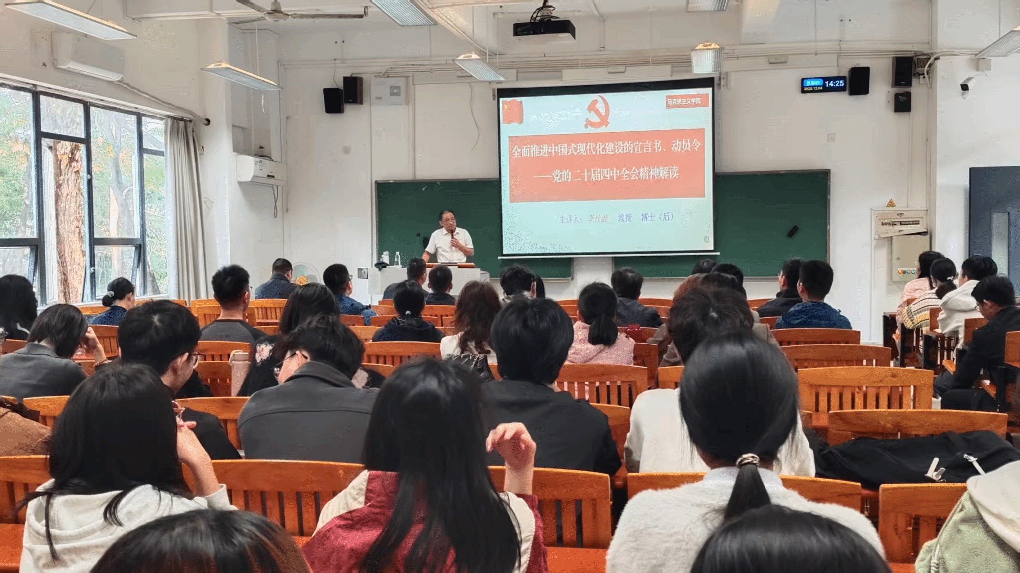 在6C101举行学习贯彻党的二十届四中全会精神宣讲报告会。报告会由学院党委书记谢炯标主持,特邀马克思主义学院李仕波教授作专题报告。学院教职工、学生党员及各班级团支部书记参加学习。